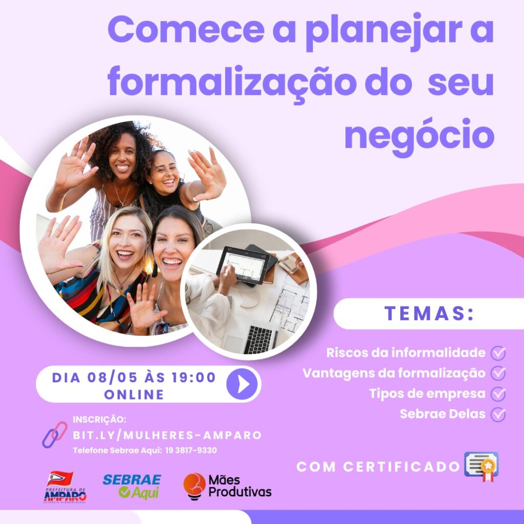 Estão abertas as inscrições para o curso “Comece a planejar a formalização do seu negócio”, voltado para o público feminino. A realização é do Sebrae Aqui, Prefeitura de Amparo e da startup “Mulheres Produtivas”.