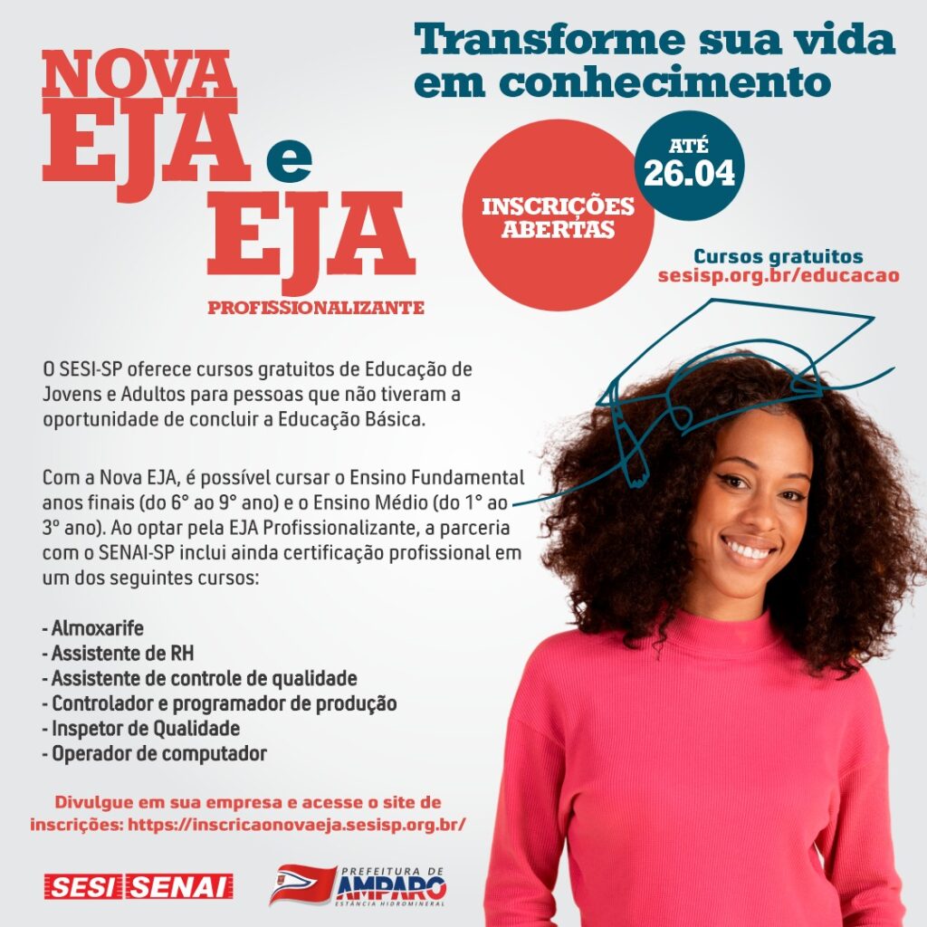 O SESI, em parceria com a Prefeitura de Amparo, oferece cursos gratuitos de Educação de Jovens e Adultos para pessoas que não tiveram a oportunidade de concluir a Educação Básica.