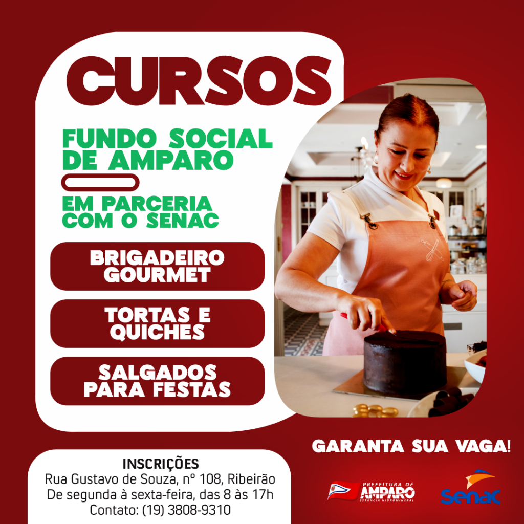 As pessoas interessadas em se desenvolver profissionalmente e criar novos meios de renda têm como oportunidade três novos cursos gratuitos em Amparo, todos na área de culinária, ofertados pelo Fundo Social, em parceria com o Senac de Itapira. Brigadeiro Gourmet; Tortas e Quiches; Salgadinhos para Festas, cada curso com 15 vagas.