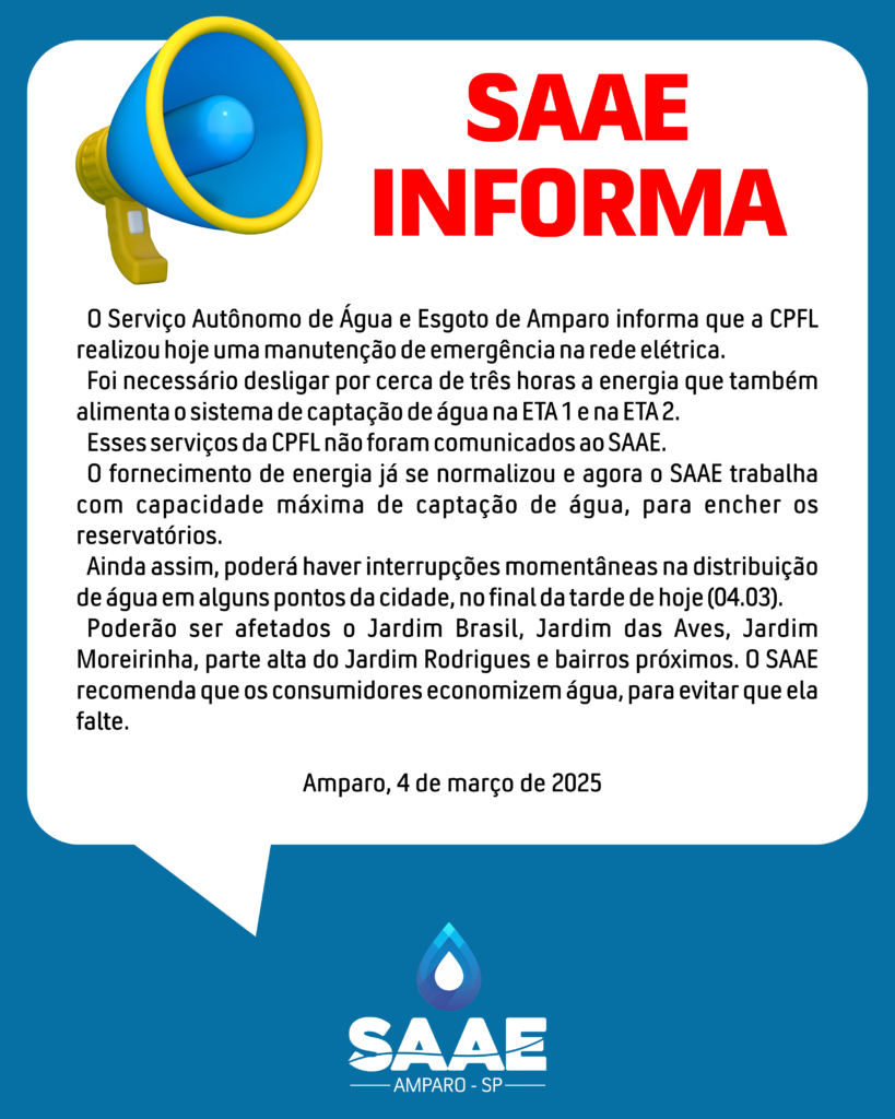 O Serviço Autônomo de Água e Esgoto de Amparo informa que a CPFL realizou hoje uma manutenção de emergência na rede elétrica. Foi necessário desligar por cerca de três horas a energia que também alimenta o sistema de captação de água na ETA 1 e na ETA 2.