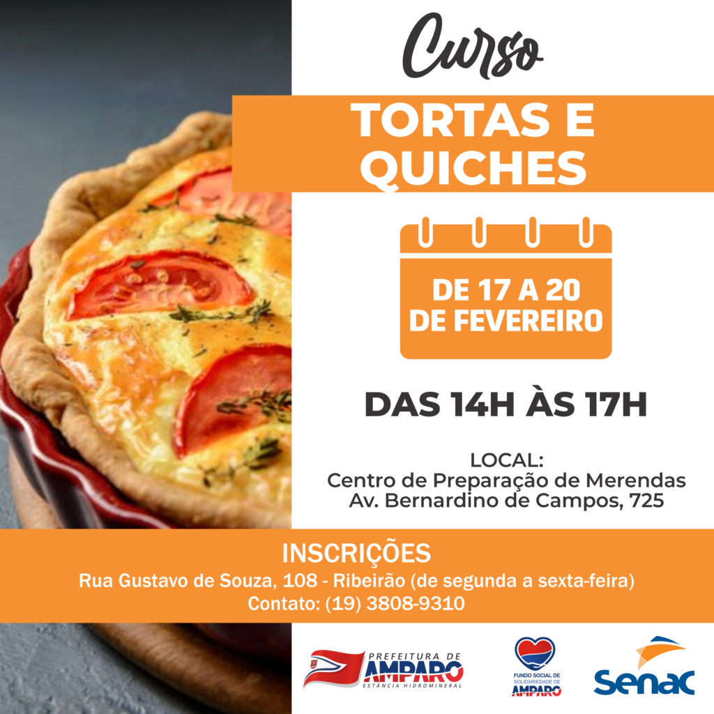 Estão abertas as inscrições para o curso Tortas e Quiches, ofertado pelo Fundo Social de Amparo. As aulas ocorrem de 17 a 20 de fevereiro, das 14h às 17h.