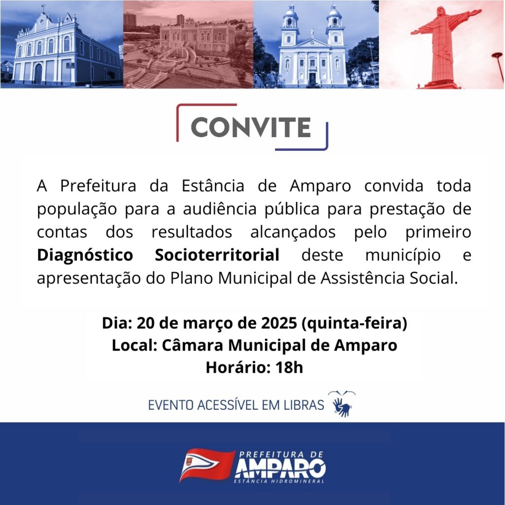 Na quinta-feira, 20 de março, às 18h, na Câmara Municipal, a Prefeitura Municipal de Amparo, através da Secretaria de Desenvolvimento Social, Direitos Humanos e Cidadania, realiza a audiência pública para apresentação dos resultados alcançados pelo Diagnóstico Socioterritorial do município, que traz dados importantes sobre a população, os territórios locais e dinâmicas relacionais.