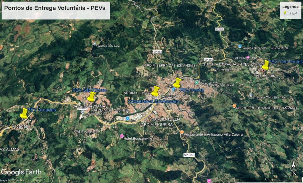 Além dos 4 pontos instalados na cidade, e que estão liberados 24h, a sede da Eco Amparo também recebe materiais, porém, em horário comercial, de segunda a sexta-feira, das 8h às 17h.