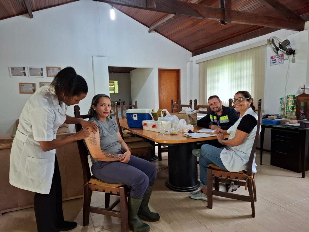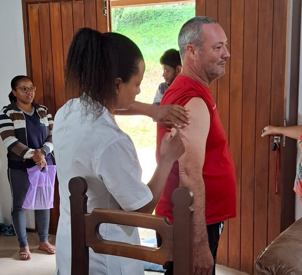 No total foram 14 famílias e 40 pessoas atendidas. Foram aplicadas vacinas Dupla adulto (11 doses) Hepatite B (10 doses), SCR – sarampo, caxumba, rubéola (11 doses) e Febre amarela (14 doses)