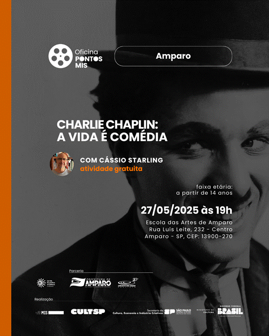 No dia 27 de maio, às 19 horas, a Escola das Artes de Amparo em parceria com o projeto Pontos MIS realizam a oficina Charlie Chaplin – A Vida É Comédia;
