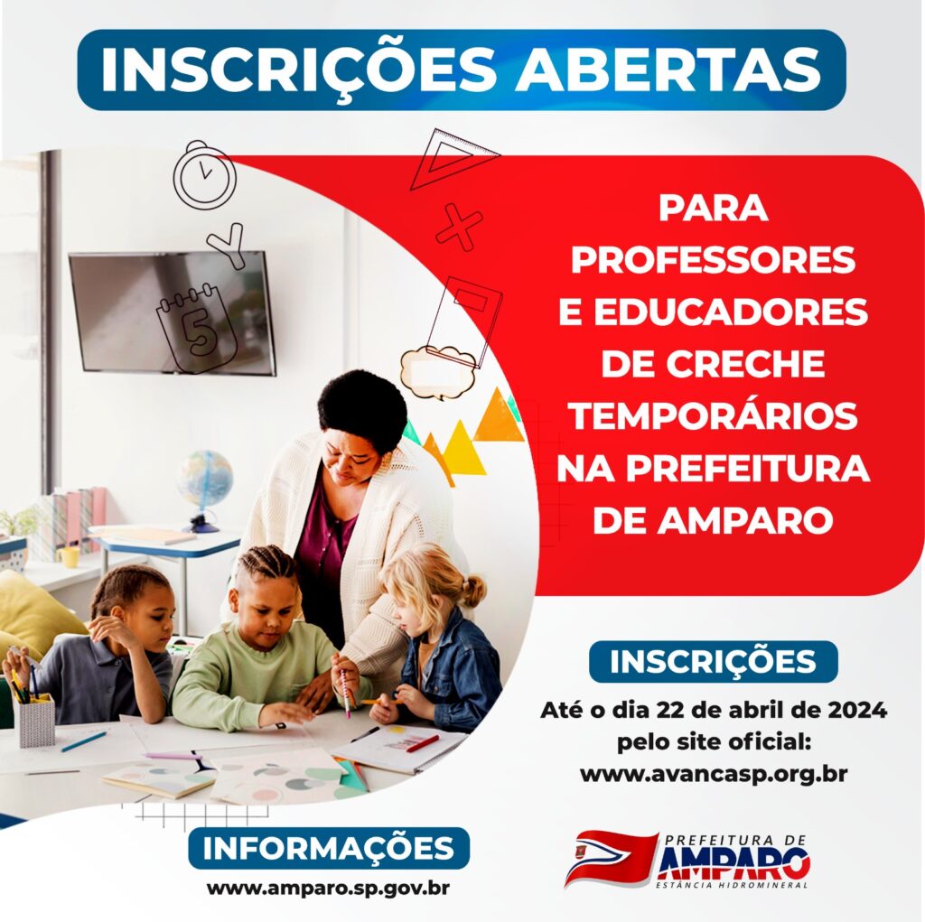 Estão abertas as inscrições para o processo seletivo de professores e educadores de Creche para contratação temporária, junto à Prefeitura da Estância de Amparo, visando suprir demandas essenciais na área da educação. As inscrições podem ser feitas até o dia 22 de abril de 2024 pelo site oficial www.avancasp.org.br.