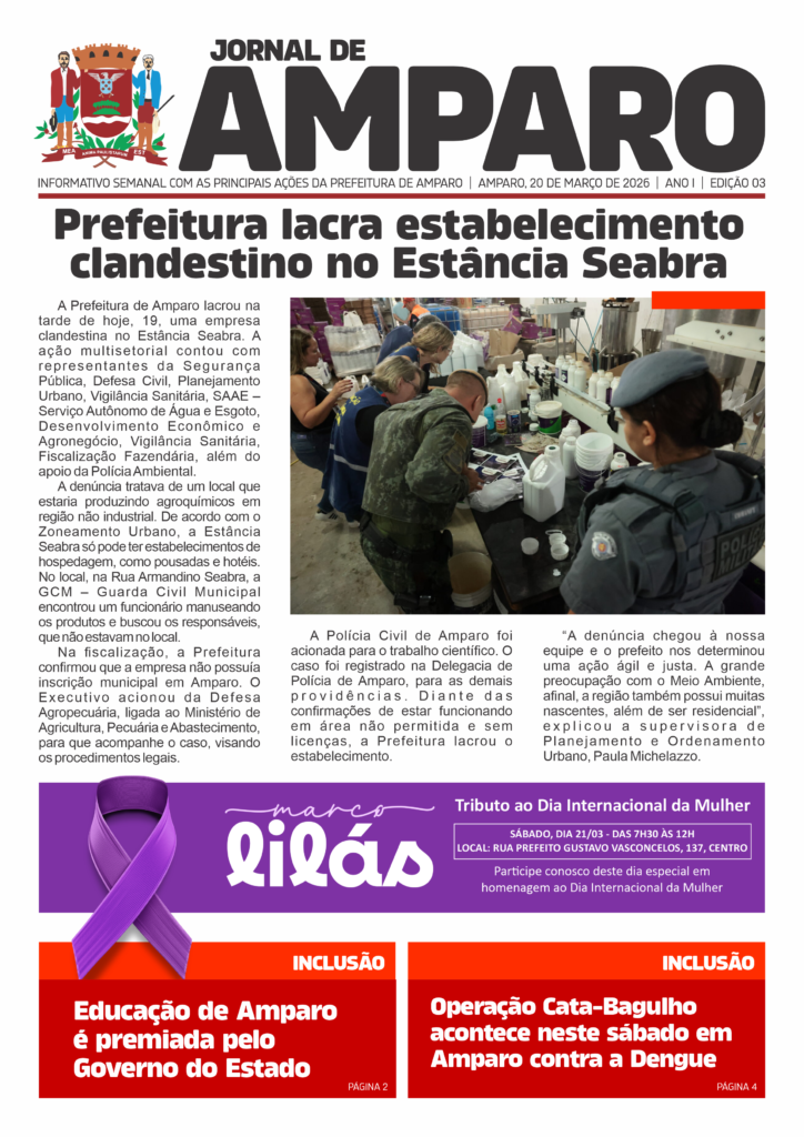 A Prefeitura de Amparo lacrou na tarde de hoje, 19, uma empresa clandestina no Estância Seabra. A ação multisetorial contou com representantes da Segurança Pública, Defesa Civil, Planejamento Urbano, Vigilância Sanitária, SAAE – Serviço Autônomo de Água e Esgoto, Desenvolvimento Econômico e Agronegócio, Vigilância Sanitária, Fiscalização Fazendária, além do apoio da Polícia Ambiental.