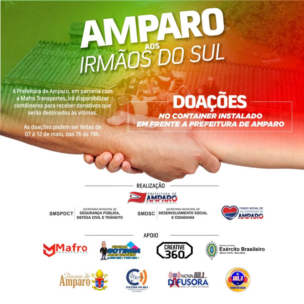 A Prefeitura da Estância de Amparo, lançou nesta terça-feira, 07, a campanha “Amparo aos irmãos do Sul”. O objetivo dessa iniciativa é arrecadar doações e prestar auxílio às vítimas da recente catástrofe que assola o estado do Rio Grande do Sul.