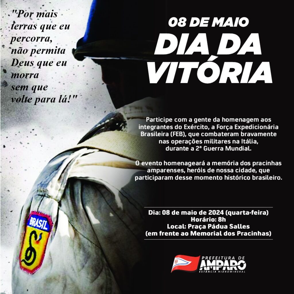 No próximo dia 08 de maio, quarta-feira, a comunidade de Amparo se reunirá às 8h na Praça Pádua Salles para celebrar o “Dia da Vitória”, uma ocasião solene que marca o término da Segunda Guerra Mundial, há 79 anos.