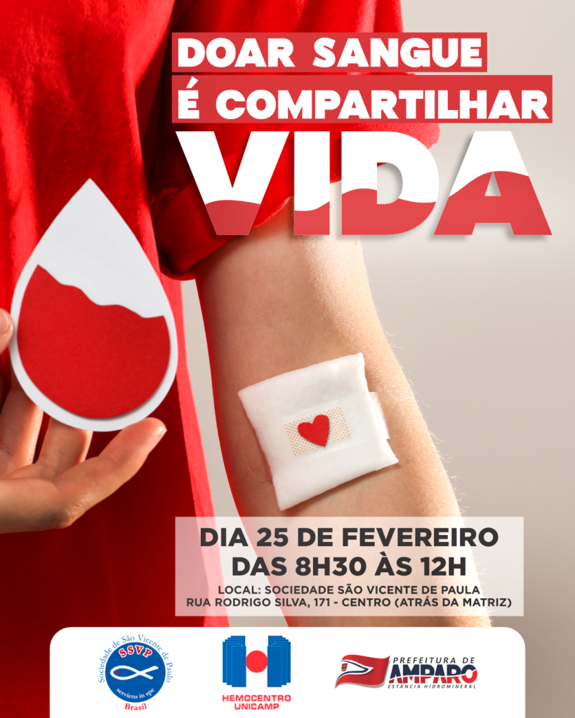 Na próxima terça-feira, 25, tem Campanha de Doação de sangue em Amparo, numa ação conjunta entre a Prefeitura, por meio do CTA – Centro de Testagem e Aconselhamento, Secretaria Municipal de Saúde, Associação dos Vicentinos e a equipe do Hemocentro da Unicamp